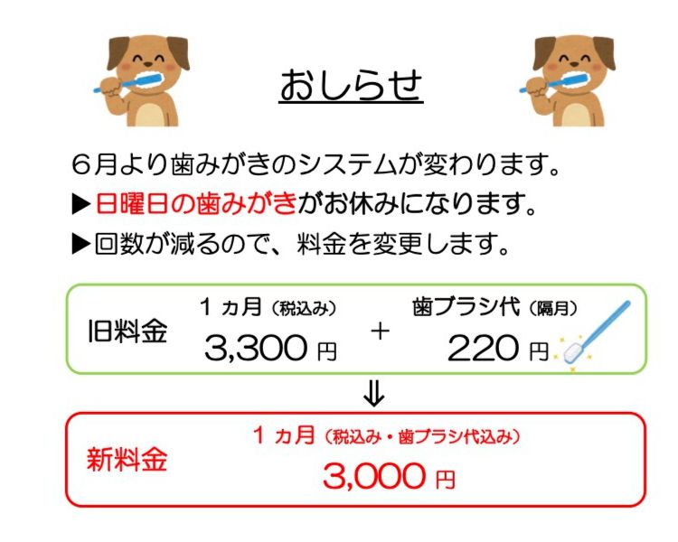 日曜日は診察のみとなります。爪切りなどのお手入れ、歯磨きマラソンは平日(土曜日含む)だけとなりますのでご了承ください。歯磨きマラソンについては、料金などの変更がありますので詳しくはスタッフまで。