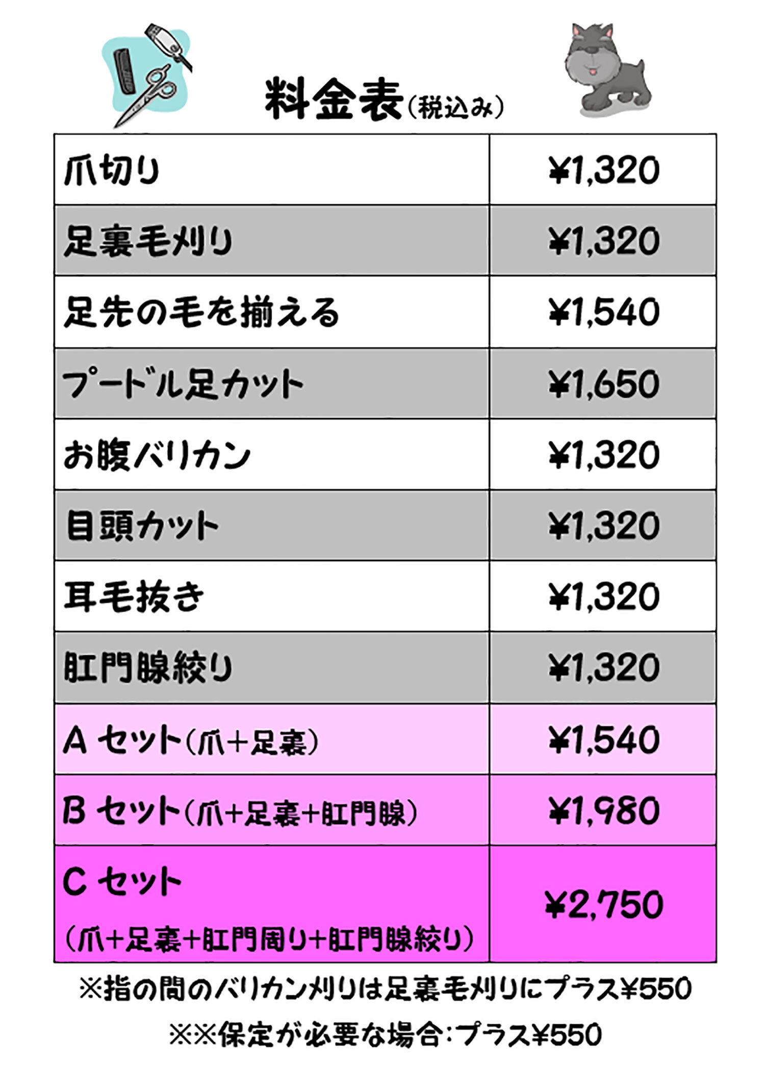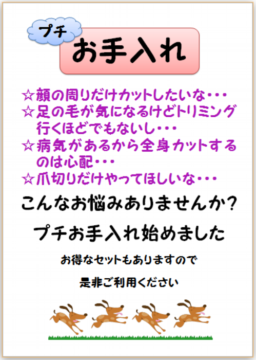 日曜日は診察のみとなります。爪切りなどのお手入れ、歯磨きマラソンは平日(土曜日含む)だけとなりますのでご了承ください。歯磨きマラソンについては、料金などの変更がありますので詳しくはスタッフまで。